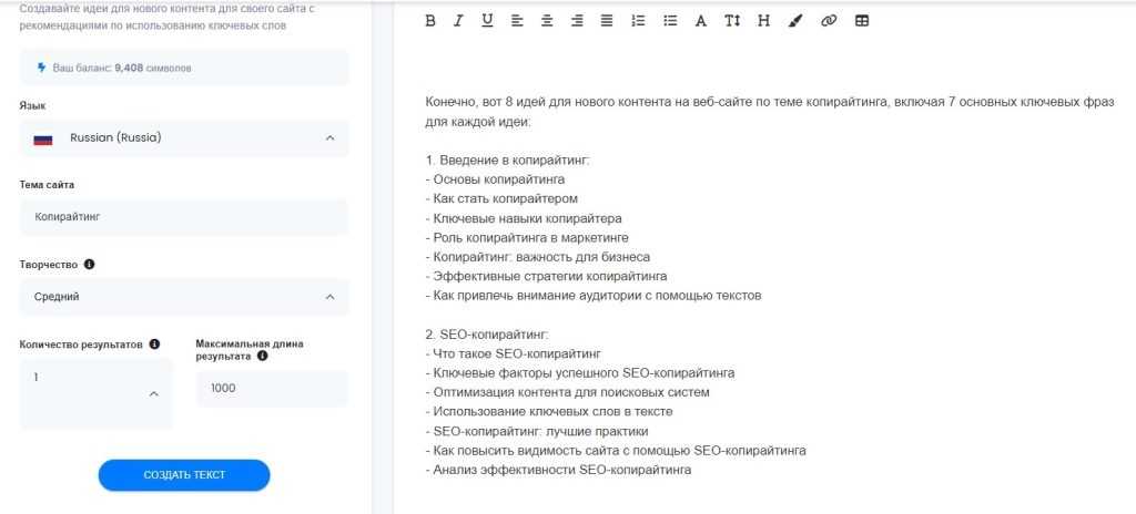 Здесь вы можете сгенерировать уникальные тексты с помощью различных инструментов, которые упрощают работу. Из интересного — есть функция рерайтинга, генерирования заголовков, можно продолжать текст, проводить SEO-анализ и даже переводить. В общем, если вы как-то связаны с копирайтингом, то однозначно рекомендуем ознакомиться.