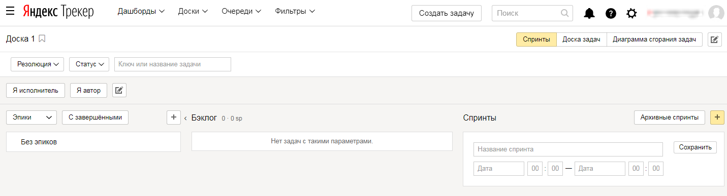 При использовании доски типа «Скрам» больше внимания уделяется спринтам – промежутки времени для выполнения запланированной части проекта, а также упорядочению задач согласно приоритетности их выполнения. Для создания нажимаем «Доски» — «Создать доску задач» — «Скрам». И заполняем поля.