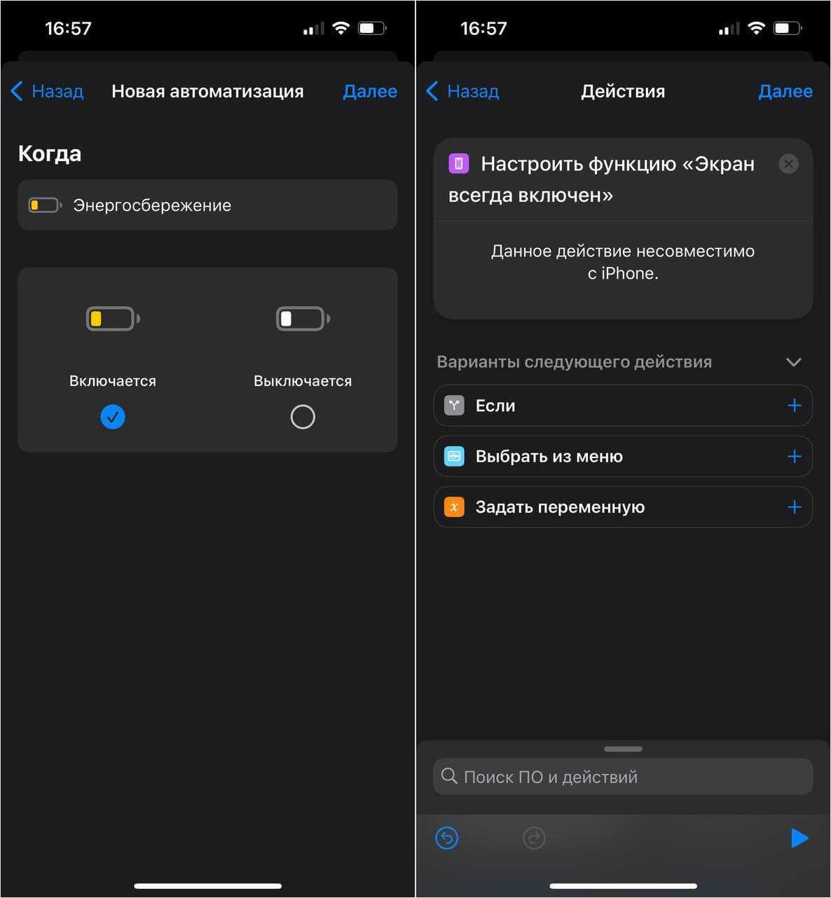 Функция пригодится владельцам iPhone 14 Pro и Pro Max. Можно создать условие, при котором Always On Display отключится автоматически на ночь, на работе или при подключении к розетке.