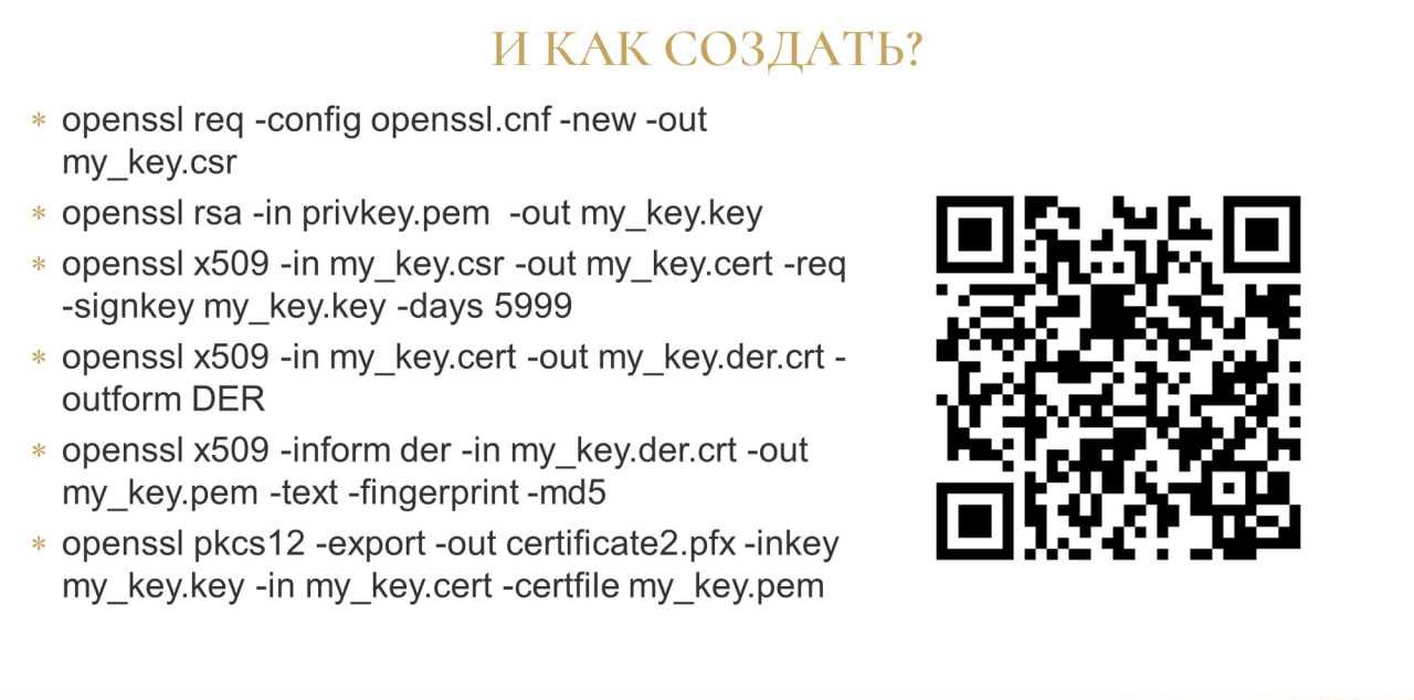 Чтобы задействовать сертификат безопасности, в командной строке на сервере нужно запустить приведенный на слайде код – в статье приведено детальное описание, как все это сделать и создать сам ключ.