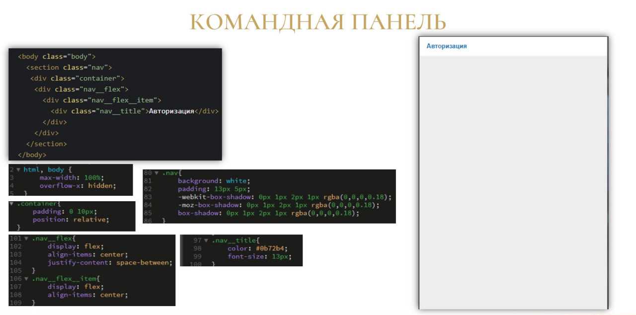 На панели у меня отображается команда «Авторизация» – на слайде показан ее HTML-код, видно, что структура панели состоит из div-ов.