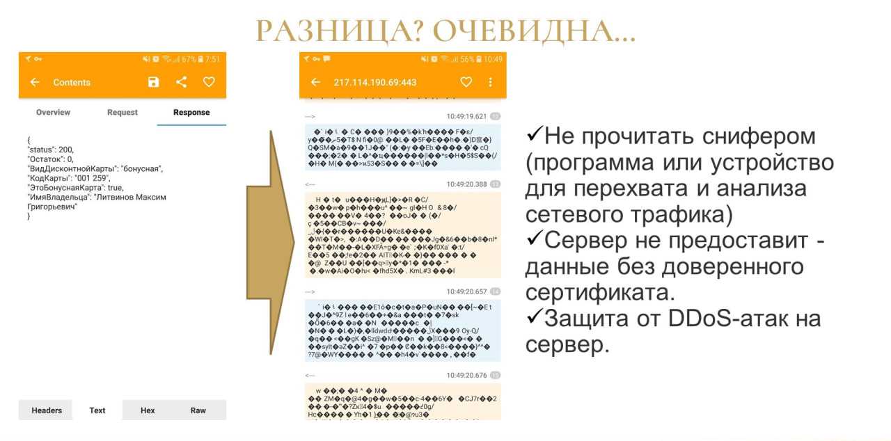 Изначально, когда я разработал приложение, все передаваемые по JSON данные были открыты – это видно слева на слайде. Я скачал снифер и посмотрел, как выглядят данные, которые я передаю в приложении – все данные по IP-шникам и именам владельцев карт были открыты, а это плохо.