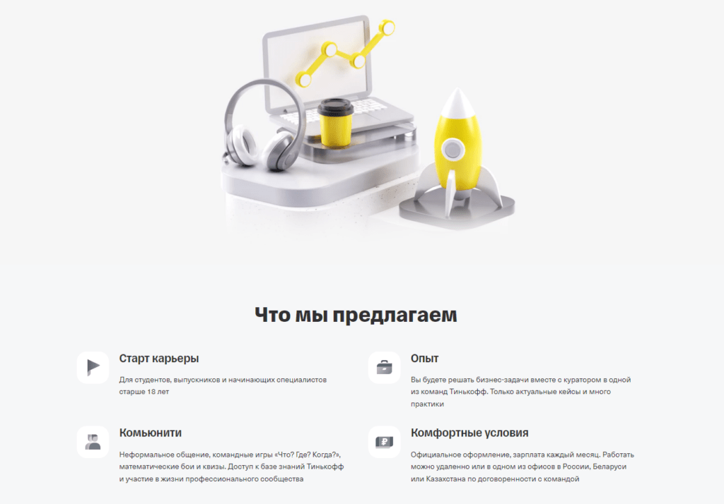 Бессрочная программа стажировок от Тинькофф, в которой регулярно появляются новые вакансии. Участвовать могут студенты, выпускники и начинающие специалисты. Банк размещает вакансии в разных сферах, но в конкретный момент актуальны могут быть только некоторые. Например, сейчас ищут диджитал-маркетолога.