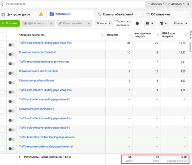 Отчет Ads Manager по покупкам и ROAS, декабрь 2020