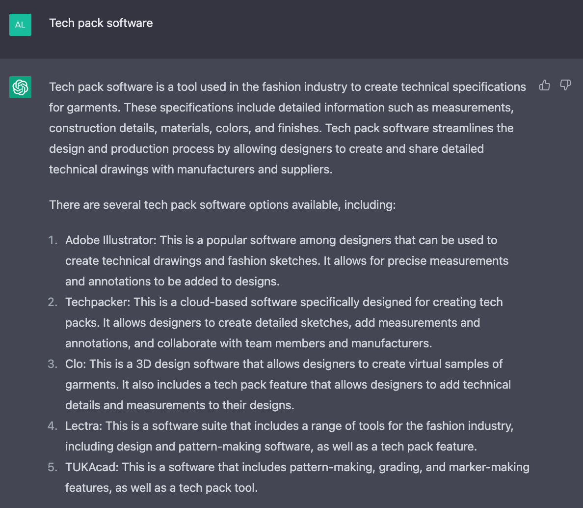The best feature of AI tools is their ability to perform intelligent extracts and summaries. It provided me with the latest software options for fashion tech packs and their brief description.