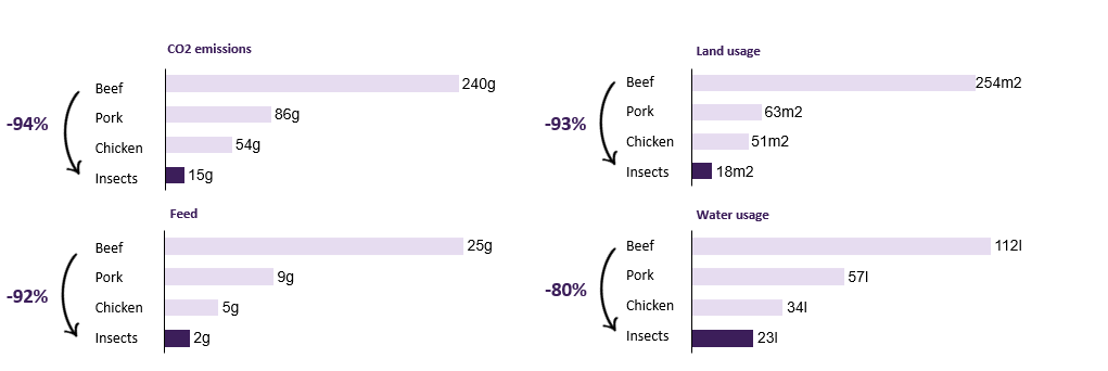 Насекомые как источник питания имеют множество преимуществ для устойчивого развития благодаря природе их первичного производства. Насекомые имеют очень высокую эффективность преобразования корма и могут выращиваться на органических побочных продуктах, таких как побочные продукты растительного происхождения из систем производства продуктов питания человека; тем самым перерабатывая малоценные пищевые отходы в ценные белки и жиры. Насекомым требуется значительно меньше воды, и они выделяют намного меньше углекислого газа и аммиака по сравнению с традиционными источниками белка. Насекомым требуется гораздо меньше физического пространства по сравнению с домашним скотом; коммерческие предприятия по выращиванию насекомых, использующие вертикально интегрированные методы производства, могут производить 1 тонну личинок насекомых за две недели на 20 квадратных метрах земли. В отличие от этого, по оценкам около 80% мировых сельскохозяйственных земель в настоящее время используются для производства мяса и молока.