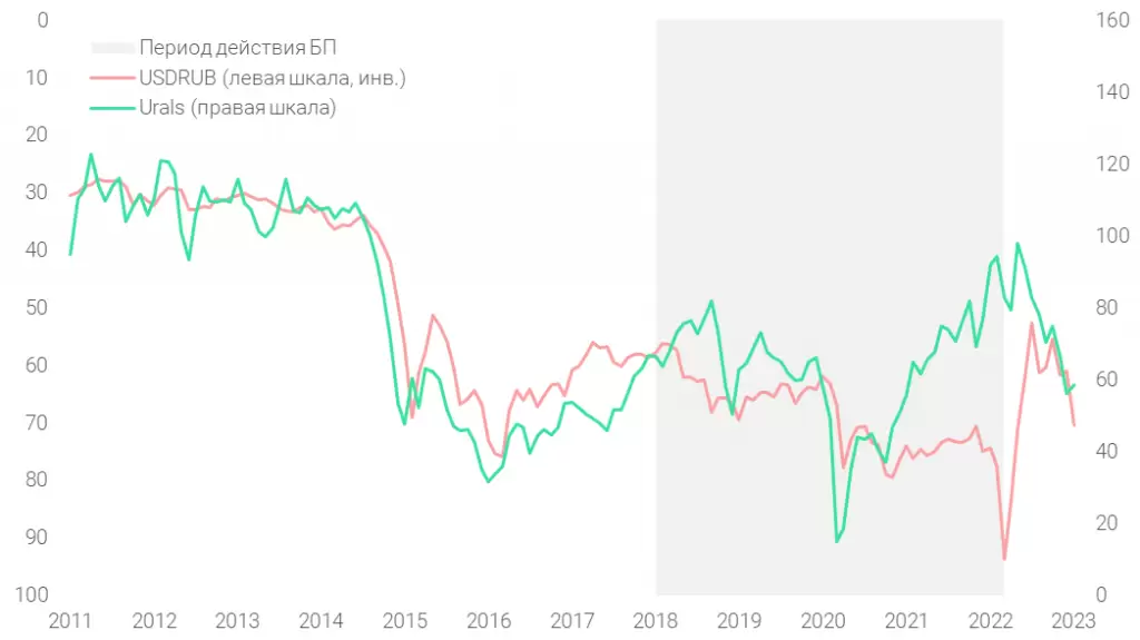 Бюджетное правило обеспечивает не только стабильность государственного бюджета, но и способствует снижению зависимости курса национальной валюты от цен на нефть. Этот эффект отлично прослеживается на графике с динамикой цен за баррель нефти Urals и курсом рубля к доллару.