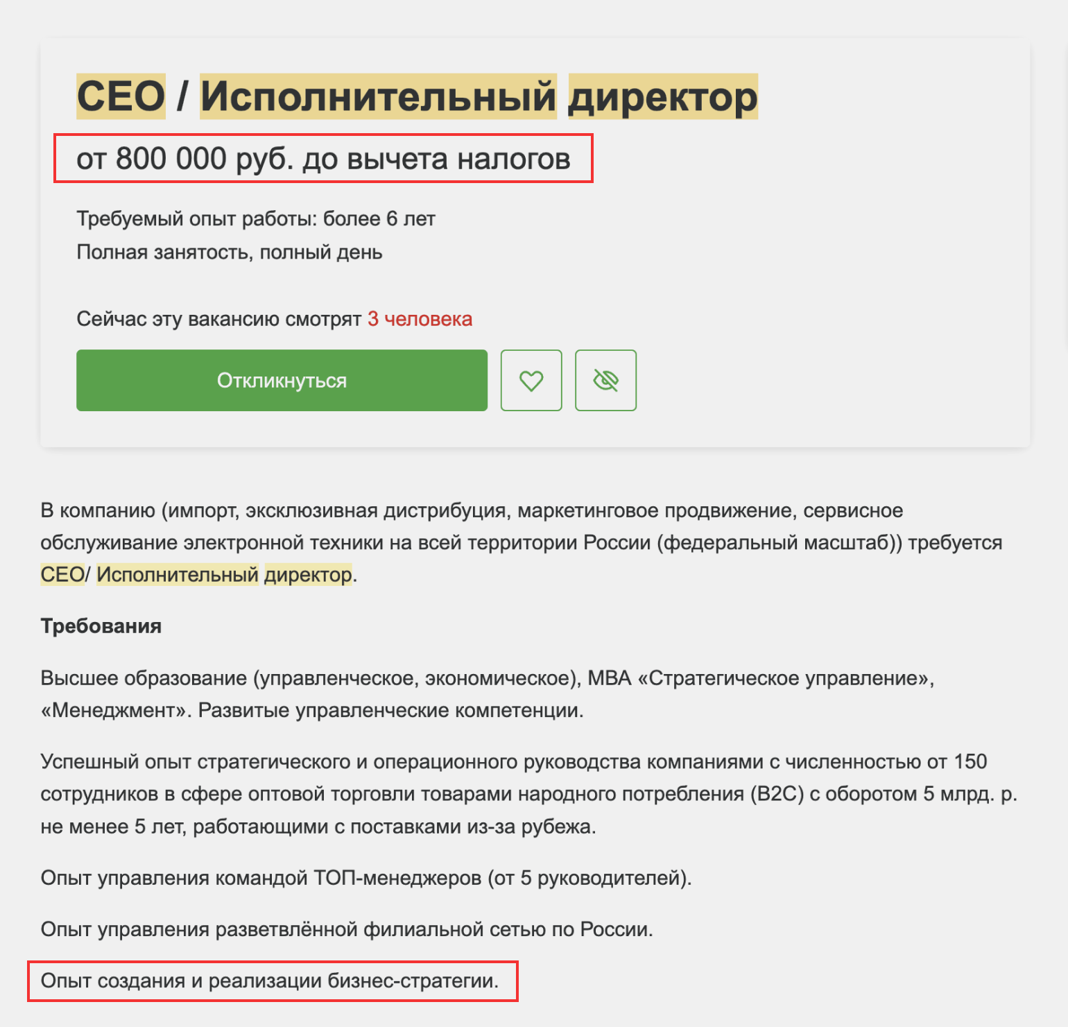 В этой вакансии предлагают зарплату от 800 тысяч и ищут человека с опытом создания и реализации стратегийСкриншот: HeadHunter / Skillbox Media