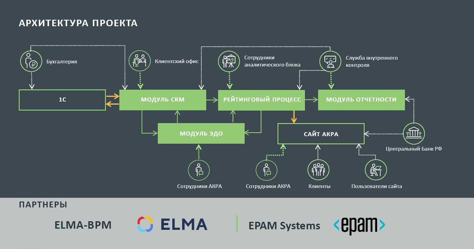 Алексей Грылев, руководитель проектов ЕРАМ, рассказал о технических особенностях проекта. ELMA обеспечивает простоту моделирования и скорость внесения изменений в процессы и помогает отслеживать, как эти изменения отражаются на бизнесе. Система ищет узкие места, что позволяет серьезно оптимизировать бизнес-процессы компании. Алексей Грылев отметил, что продукт состоит их множества частей, которые решают задачу по составлению рейтинга в компании.