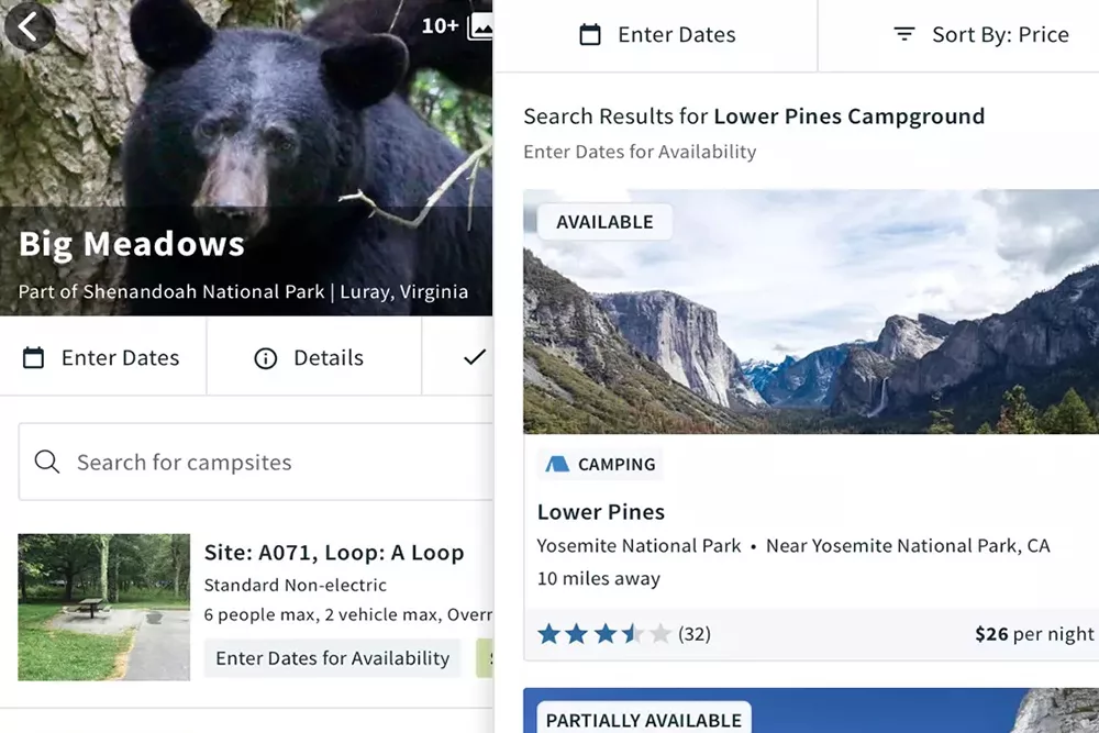 The app helps users find and reserve campsites, buy passes, review location details for upcoming trips, access information about reservations and even enter lotteries for in-demand experiences.
