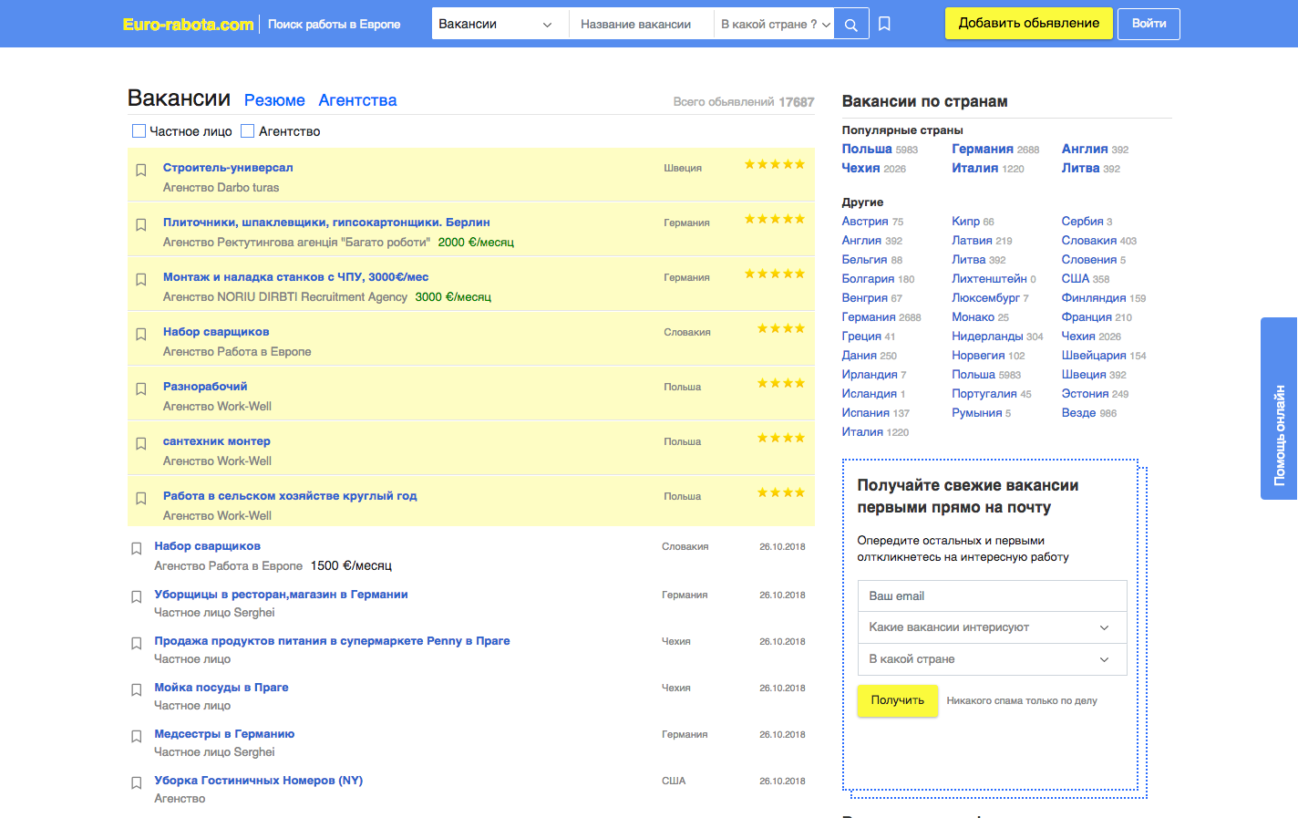 Дизайн простой, навигация максимально удобная. На главной странице ничего не отвлекает от поиска. Объявления в разделах удобно отображаются – основную информацию можно увидеть из заголовка, и не обязательно проваливаться в само объявление. Это делает поиск быстрым. В каждом разделе есть небольшие полезные заметки о поиске работы в конкретной стране и особенностях конкретной профессиональной сферы.
