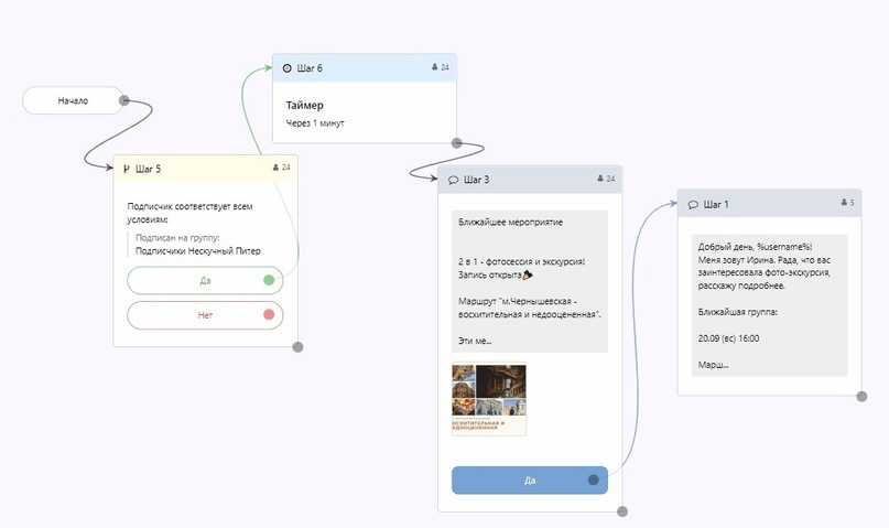 Через минуту после первого сообщения с купоном приходила информация о ближайшей экскурсии и предложение записаться/узнать подробности.