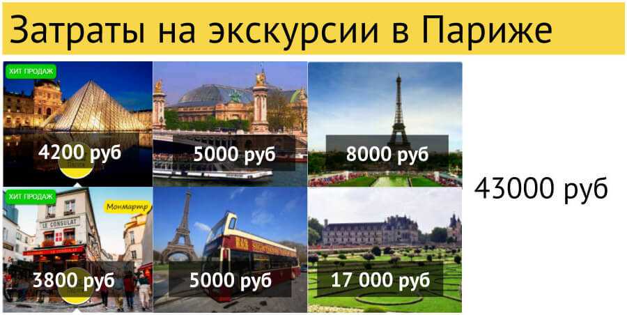 На иллюстрациях ниже приведены примерные расчеты затрат пары туристов при путешествии в Париж из Москвы и из Казани в Санкт-Петербург на неделю.