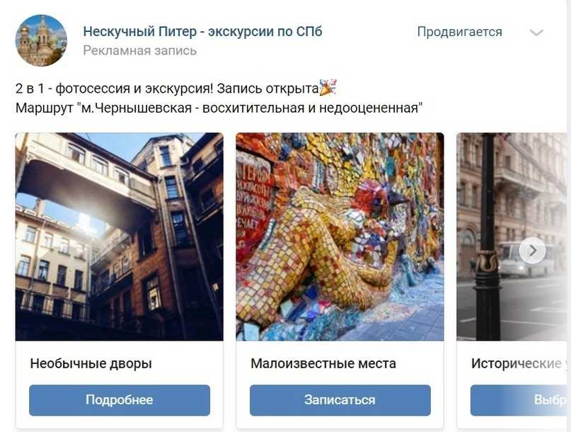 Объявления, которые показали себя лучше всего были похожи на те, что делают конкуренты. Это формат карусели и приглашение от лица гида.