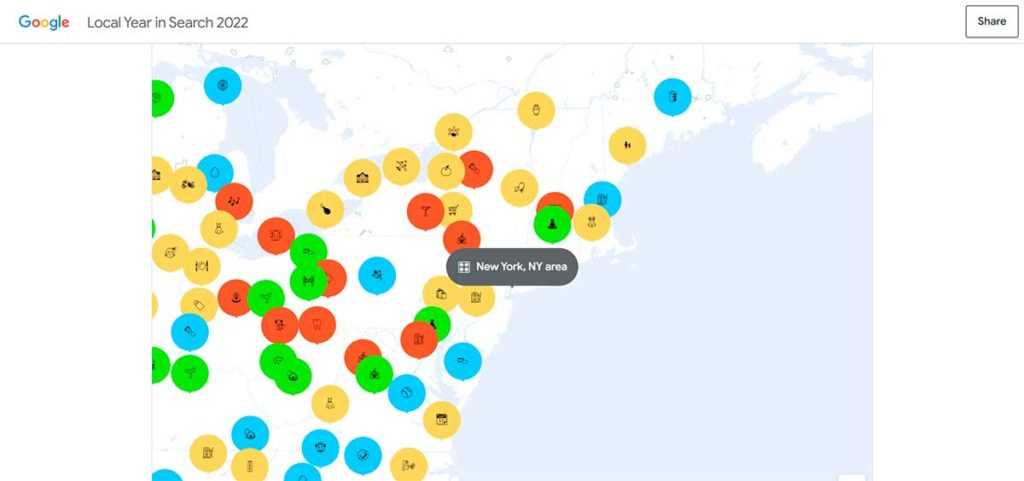 В этом году Google создал микросайт, посвящённый ведущим трендам местного поиска 2022. Вы можете изучить тенденции, введя название города США, почтовый индекс или щёлкнув по карте.