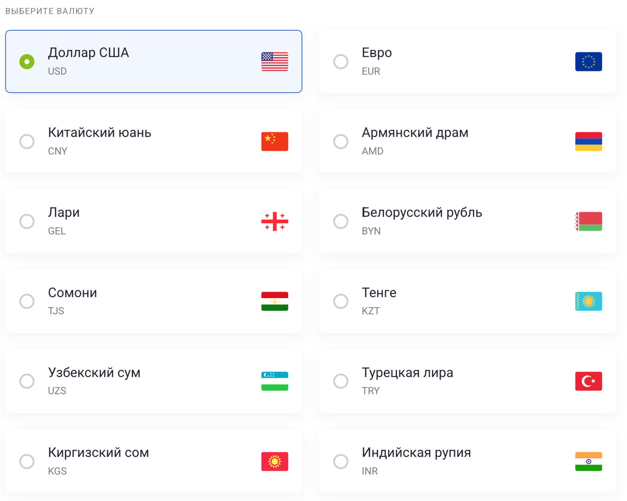 Например, вот валюты, которые предлагает в данный момент Модуль Банк.