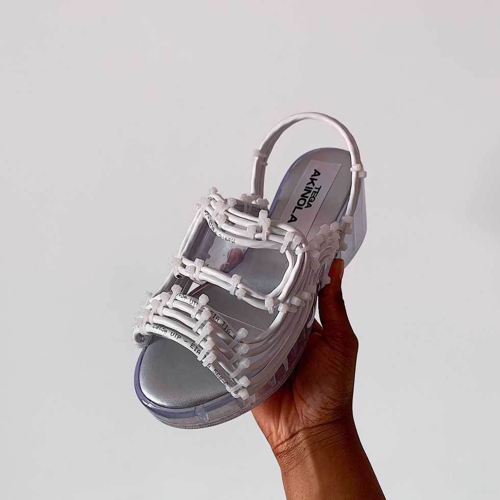 Like many pandemic-era grads, UK-based Tega Akinola was unsure what the near future would hold as far as job prospects. But over the last year, the upcycled accessories she’s dreamed up—often made from obsolete tech items and created at home with the help of her seamstress mother—have afforded the unlikely designer (she studied sports and exercise psychology) a full-time gig. “I wasn’t consciously thinking about sustainability,” Akinola says. “Upcycling was something I had to do, because I didn’t have money to buy new things.” Among her first and most challenging pieces were a bucket hat and a pair of block-heeled sandals fashioned from defunct cables, which caught the eye of APOC Store founders Ying Suen (who also acted as her primary mentor) and Jules Volleberg. Requests for custom pieces have come flooding in via Instagram, and Swedish singer Snoh Aalegra is a fan of the bags Akinola creates from secondhand fleece garments, logos intact. With so many of Akinola’s raw materials coming from sustainability-minded brands such as Nike and Patagonia (not to mention her interest in sports), a collaboration seems only natural. Here’s hoping. This article appears in the August 2022 issue of ELLE.