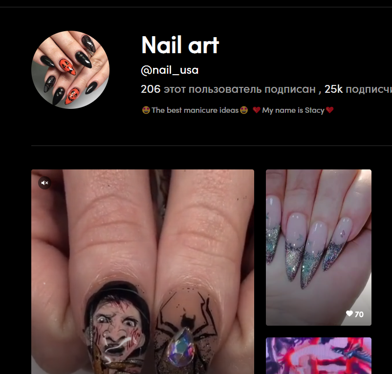 Nail art – отличный пример канала Тик Ток, который продвигает услуги. Основная часть контента на этом аккаунте – макросъемка создания маникюра. На первый взгляд – звучит довольно просто. На практике – выглядит завораживающее. Такое интересно смотреть даже мужчинам. Что уж говорить о целевой аудитории видеоклипов – женщинах.
