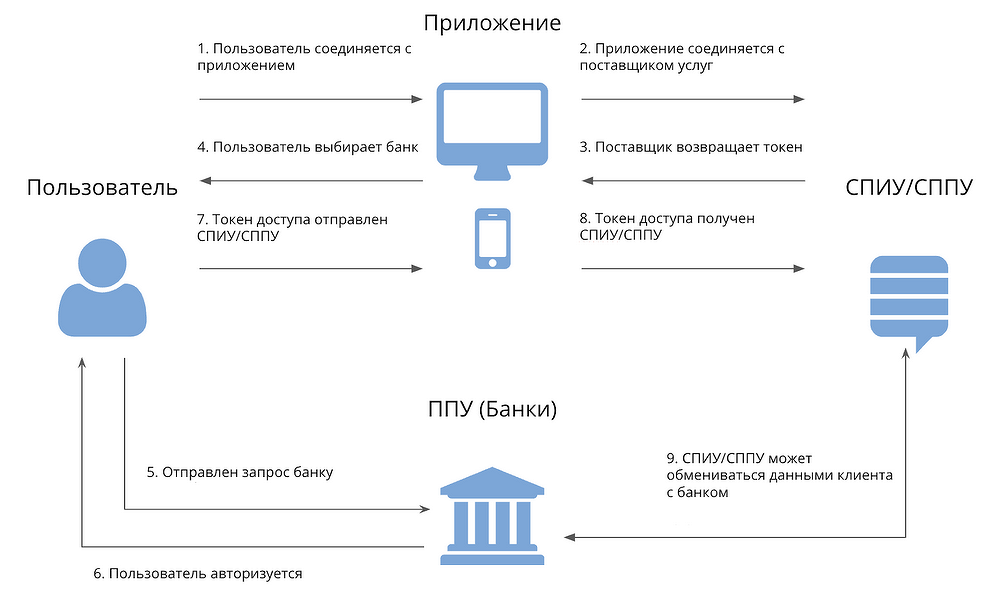 По сравнению с классической схемой появляются два новых действующих лица: СПИУ и СППУ (AISP, Account information service provider, и PISP, Payment initiation service provider).