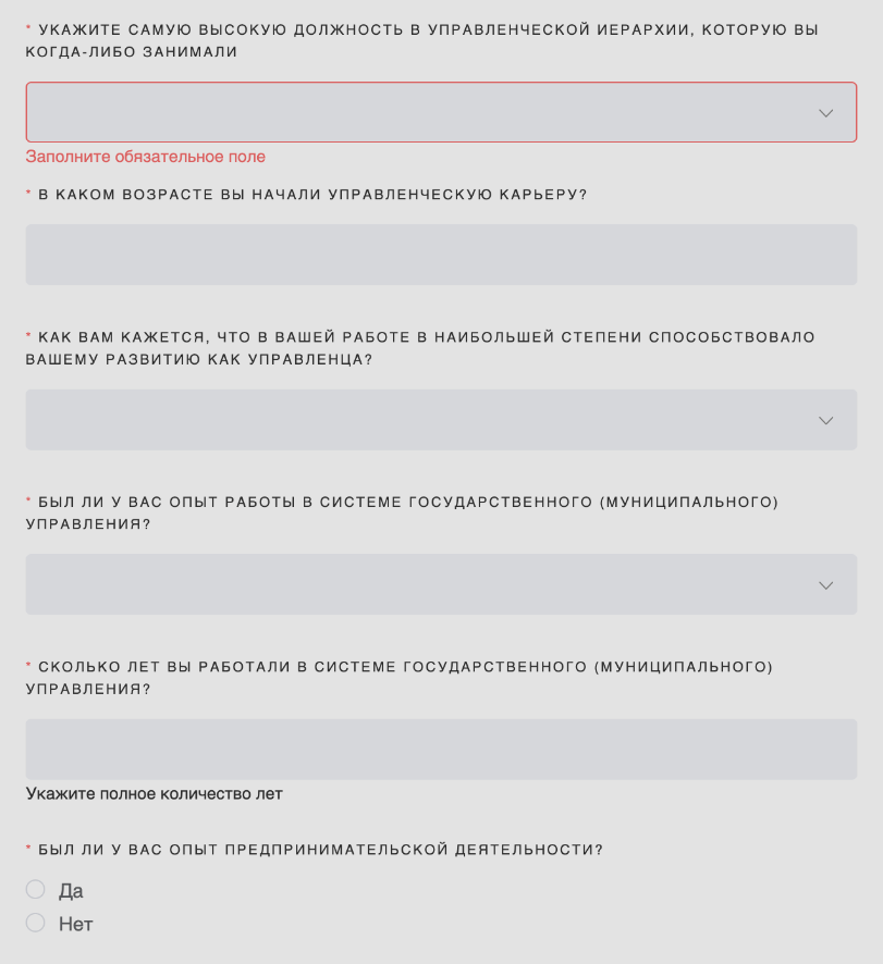 Кандидатам в «Лидеры России» придется поделиться информацией не только об опыте работы и реализованных проектах, но также о желаемых направлениях для дальнейшей деятельности, готовности к переезду и оформлению допуска к госслужбе: