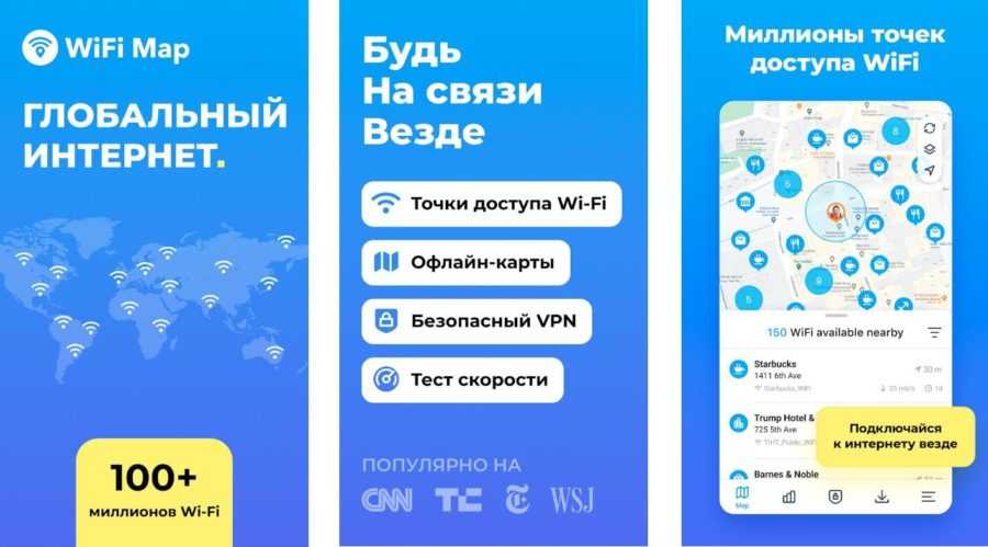 Интерактивная карта Wi-Fi Map (Google Play | App Store) в автоматическом режиме находит беспроводные Wi-Fi точки с бесплатным подключением (или же с паролем, который отображается рядом с названием сети).
