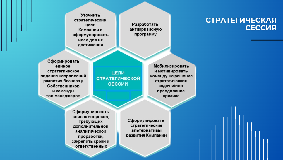 Третий. Когда грядут глобальные перемены в компании: выходы на новые рынки, структурные изменения, развитие новых направлений, создание новых продуктов. В таких случаях стратегическая сессия помогает объединить команду вокруг Большой Цели, исключить у коллектива сопротивление к изменениям.