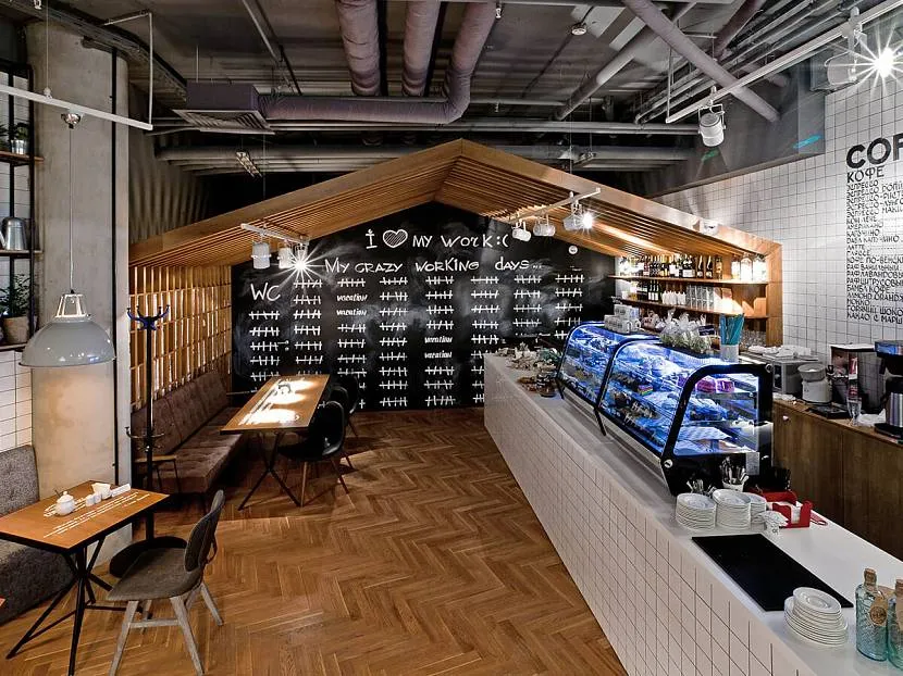 Они, вместе с деревянными элементами отделки, придают интерьеру налет респектабельности, привлекающий клиентов. Привычными деталями мини-заведений служат точечные светильники, аккуратная неоновая вывеска и непременный атрибут — грифельная меловая доска, на которую от руки выписывают цены.