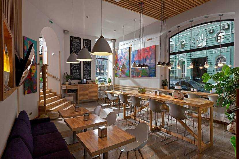Очень популярен современный декор. Он тоже не требует огромных вложений и выглядит очень привлекательно. Можно взять черный минимализм или нейтральный декор, лаконичную мебель, растения в горшках, черно-белые фото. Светлое теплое дерево и большие окна, чтобы посетители видели друг друга. Отлично смотрится скандинавский стиль со светлым деревом и пастельными штрихами делает пространство светлее и дружелюбнее.