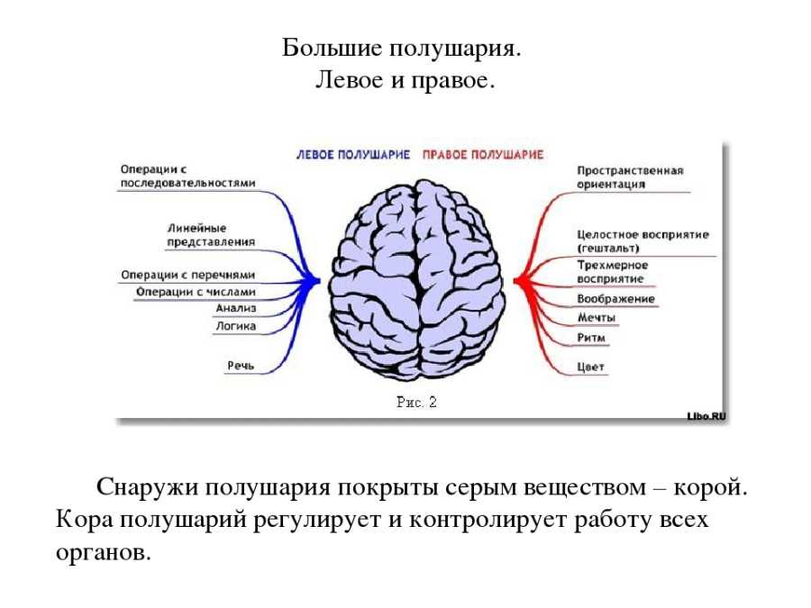 1. доминирование левого полушария — словесно-логический характер познавательных процессов, склонность к абстрагированию и обобщению (левополушарные люди);