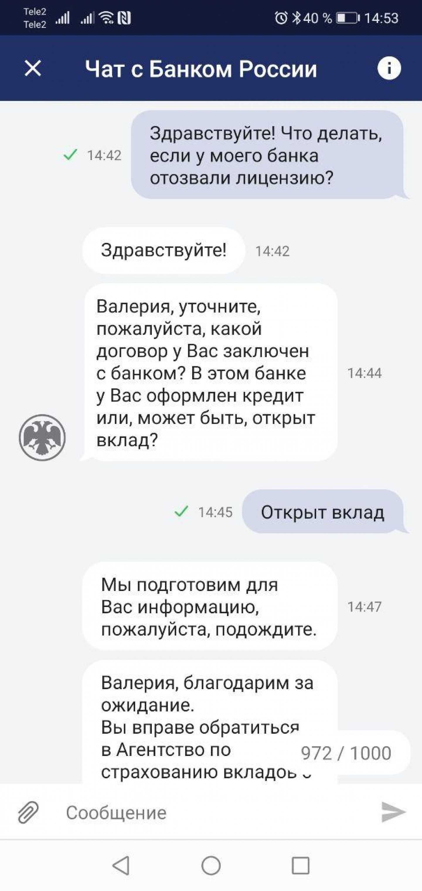 Чат с Банком России в приложении «ЦБ онлайн»