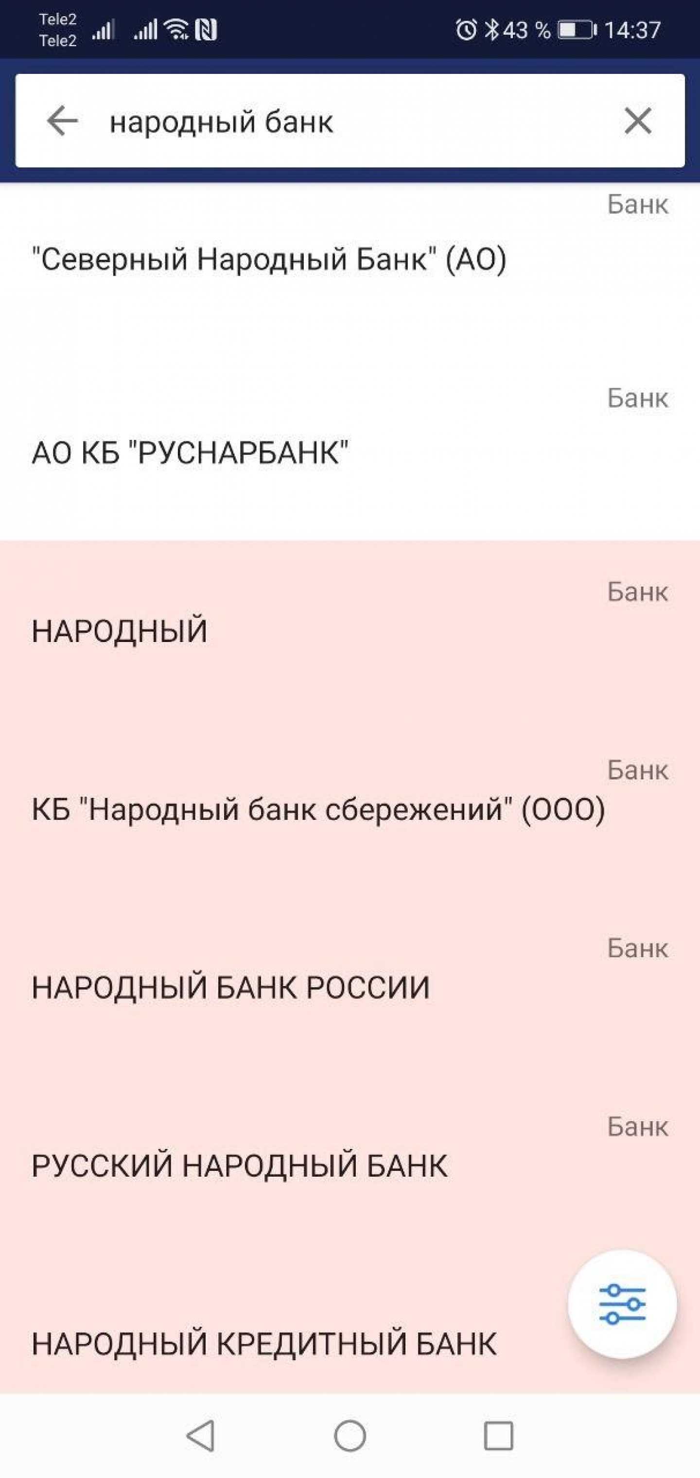 Перейдём непосредственно к функциям. С помощью приложения можно найти официальную информацию о банках, МФО и страховых компаниях. Для этого в поисковой строке на главной странице вводим название банка, МФО или страховой. Приложение выдаёт все организации, включающие введённое наименование.