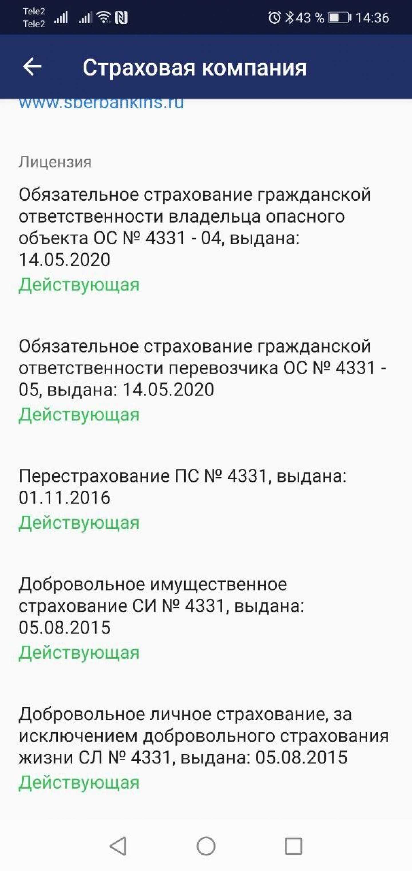 Страница страховой компании в приложении «ЦБ онлайн»