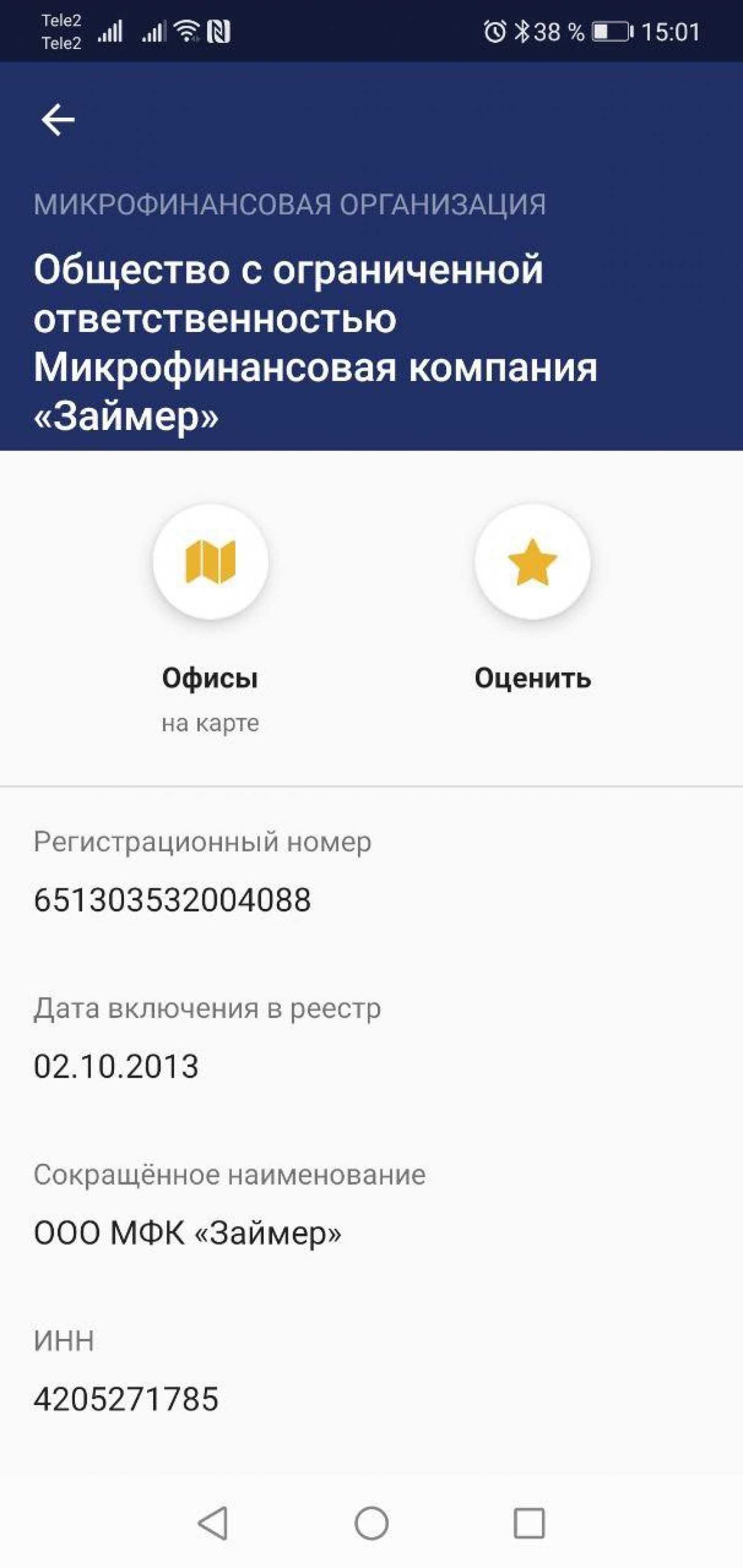 То же самое с микрофинансовыми организациями. Из информационной карточки можно узнать: регномер, дату включения в реестр, ИНН, ОГРН и официальный адрес. Также есть возможность найти ближайший офис и оценить работу МФО.