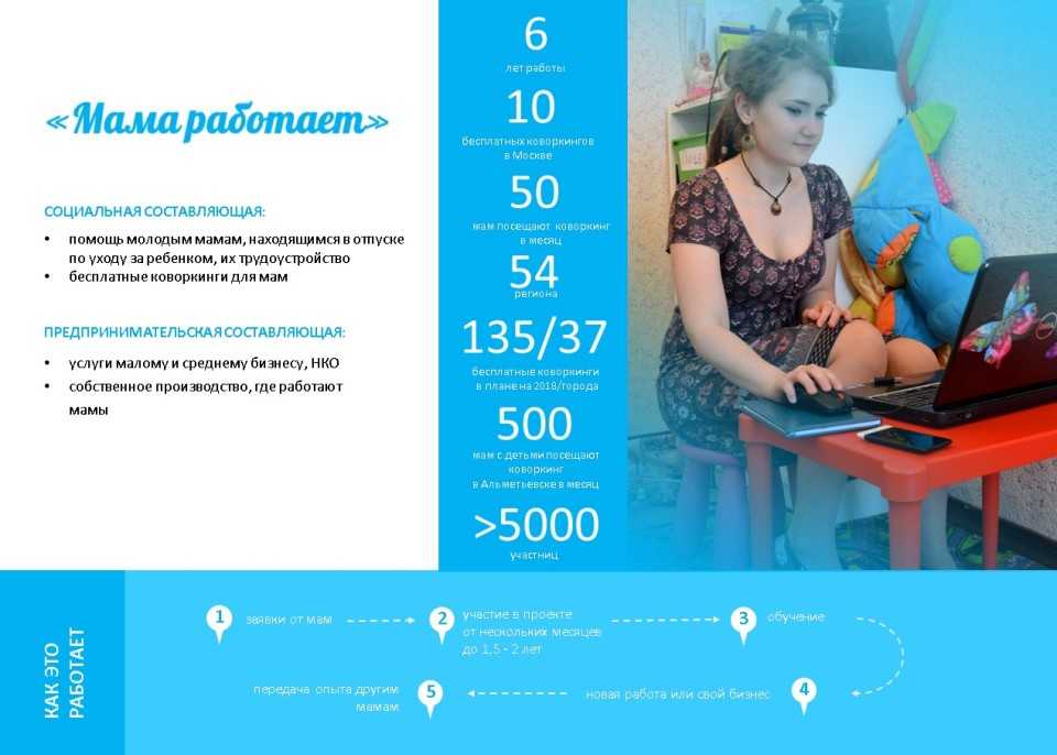 Основатель проекта: Олеся Кашаева. Год основания: 2012 г. Mom Works — это проект, который помогает молодым мамам получить образование, найти работу на дому или начать свой бизнес. Сеть бесплатных коворкингов «Мама работает» — это пространство, где мамы могут спокойно работать, пока педагог занимается детьми.