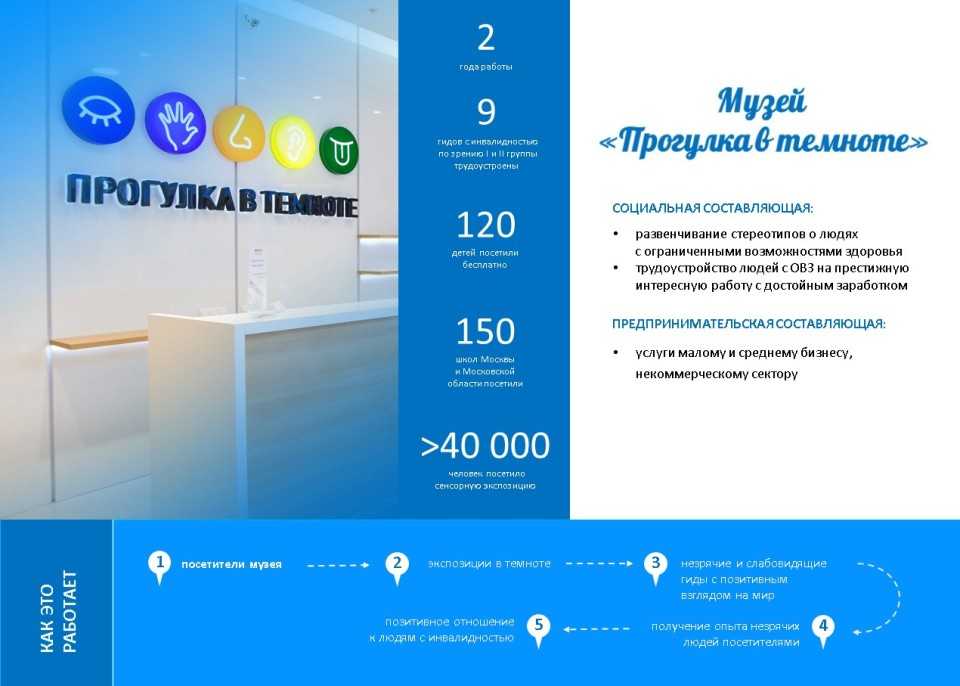 «Прогулки во тьме» — необычный музей, экспозиция которого погружена в абсолютную тьму! В музее «Прогулка в темноте» люди многое узнают о себе, так как серьезно проверяются все органы чувств, кроме зрения. Проект влияет на то, как здоровые люди воспринимают жизнь людей с инвалидностью.