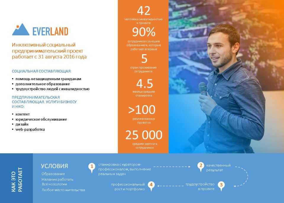 Основатели проекта: Елена Мартынова, Игорь Новиков. Год основания: 2016 . Миссия Everland – помочь специалистам с ограниченными возможностями в их профессиональной самореализации.