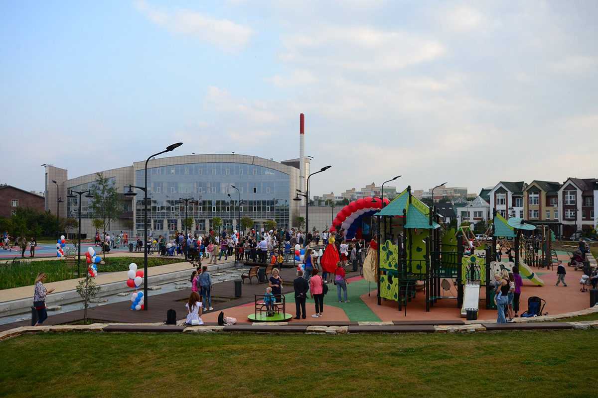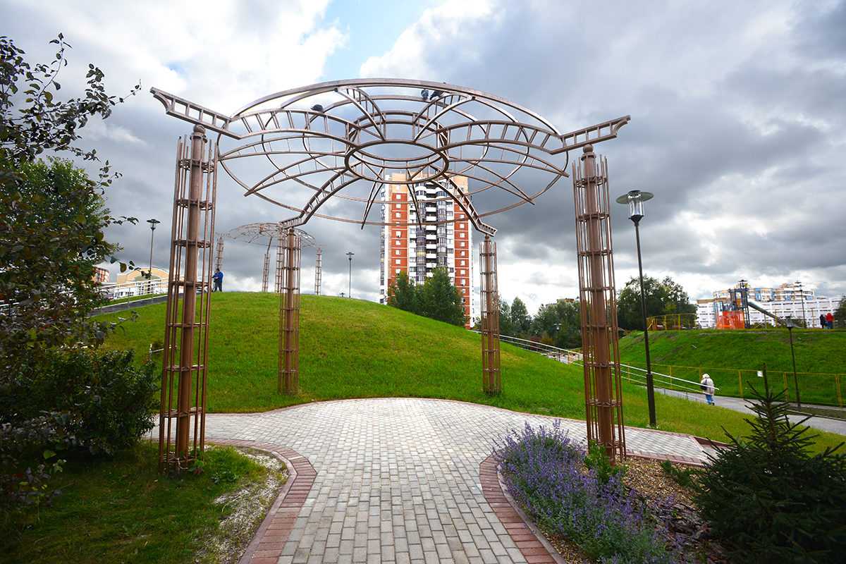 Работы в парке проходили по согласованию с жителями. Тут проложили пешеходные дорожки (кое-где их выложили плиткой, кое-где – засыпали гранитным отсевом или уложили деревянный настил). Одной из главных достопримечательностей нового парка стал так называемый дождевой сад. Для его обустройства специалисты переложили канализационные сети и расчистили пониженный участок территории. На дне низины установили наполненные щебнем габионы, а на склонах высадили влаголюбивые растения — бадан, ирис, канареечник, белокопытник. В центральной части парка провели необычный фонтан – один из его участков напоминает горный ручей, посреди которого лежат огромные валуны.