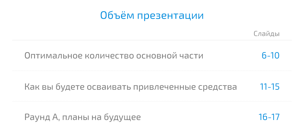 - Не включайте условия сделки в презентацию, а сообщите то лично. Условия могут менять от инвестора к инвестору.