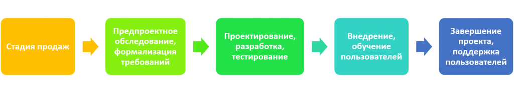 Жизненный цикл проекта по внедрению программ 1С состоит из нескольких этапов, на каждом из которых присутствуют свои риски. Также существуют общие риски всего проекта.