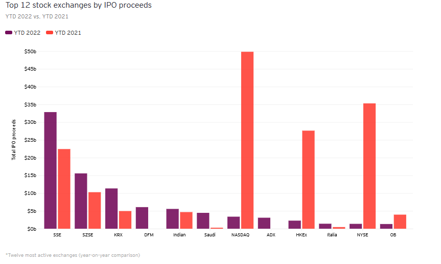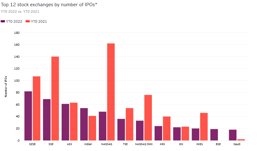Начиная с января 2022 года на рынке было проведено 630 IPO с привлечением 95,4 млрд долларов. По сравнению с первыми шестью месяцами 2021 года эти цифры упали на 46% и 58% соответственно. Новые компании чаще становились публичными на азиатских фондовых биржах, чем на американских.