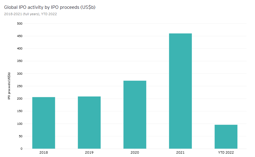 Мировой рынок IPO переживает значительное падение в 2022 году, особенно после рекордного 2021 года. Интенсивность рынка продолжала падать в первом и втором кварталах, что привело к сокращению как количества IPO, так и доходов.