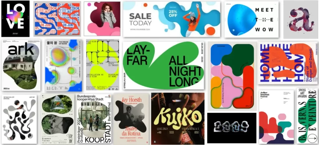 Стиль капля, или еще называют как блоб (от английского blob), узнаваема по использованию аморфных лужеподобных форм в качестве основного элемента визуального дизайна в макете. Форма может быть использована как простое яркое средство для цветового поля, или ее можно использовать для маскировки иллюстраций или фотографий визуально интересным способом.