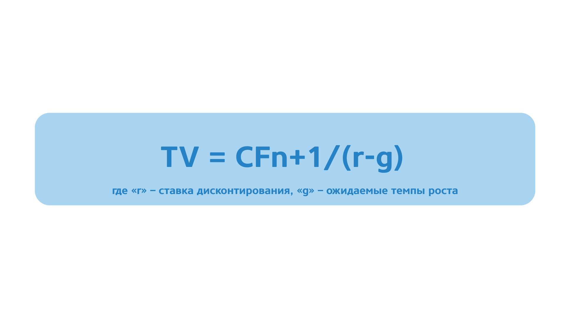 Допустим, вы прогнозируете денежные потоки на N лет вперед. Что случится потом? На этот вопрос отвечает терминальная стоимость (terminal value, TV).