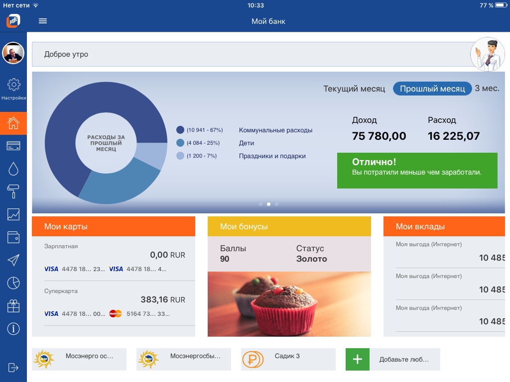 Наглядный интерфейс с всплывающими подсказками и предсказуемой структурой платежей, статистики и дополнительных сведений