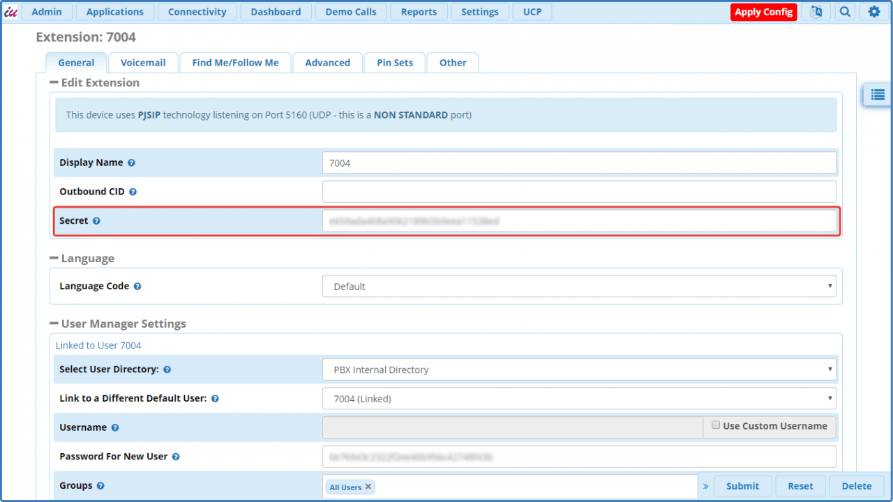 Получить требуемые сведения можно напрямую у провайдера виртуальной АТС. Например, для FreePBX: Server соответствует адресу, Port есть в настройках, Secret можно задать путем создания внутреннего номера в разделе Applications.