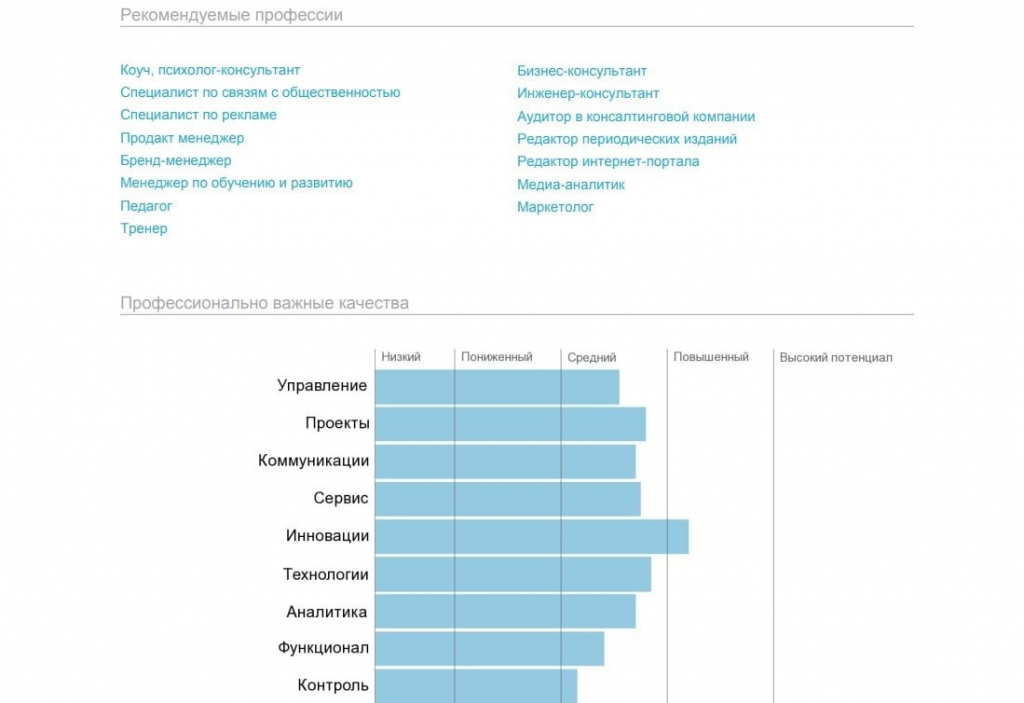 Что показывает: структуру интеллекта (абстрактная и зрительная логика, эрудиция и пр.), личностные особенности (экстраверсия/интроверсия, превалирование эмоций или разума в принятии решений и т. д.), профессиональные качества и интересы. Кликнув по рекомендованным профессиям, вы попадёте на список вакансий и сможете посмотреть типичные задачи специалиста, необходимые навыки и уровень зарплаты. В некоторых случаях тест может рекомендовать развивать навыки, необходимые для перехода на подходящую позицию.