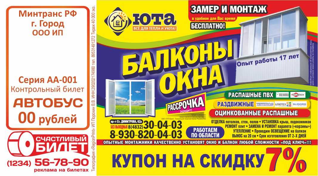 В качестве рекламного носителя мы выбираем билет. Его формат 9 на 5 сантиметров, реклама будет цветной, печать наносится с двух сторон. Печать будет наноситься собственными силами агентства с использованием самого лучшего оборудования и материалов.