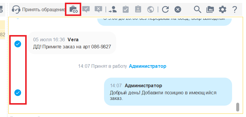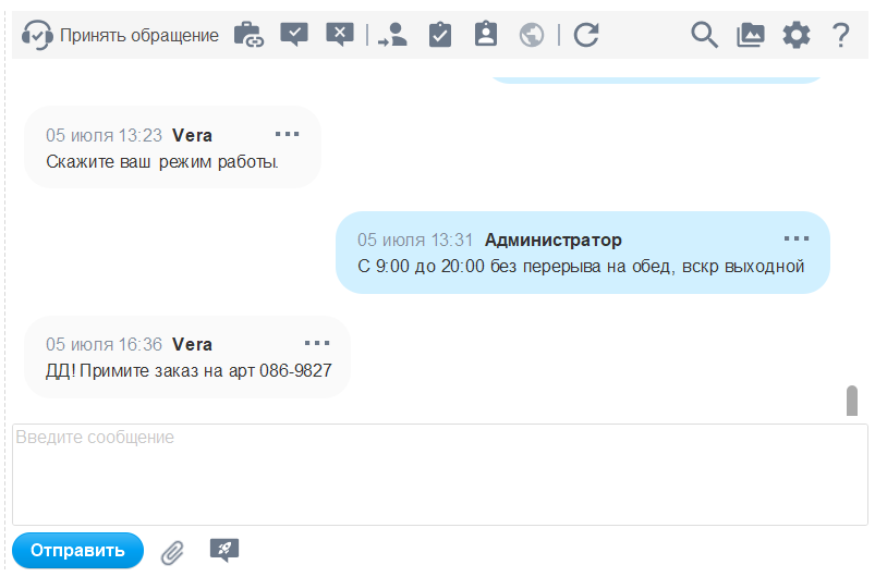 После применения настройки диалоговое окно будет отображаться в виде единой переписки с клиентом. Для просмотра старых сообщений необходимо подняться выше по чату.