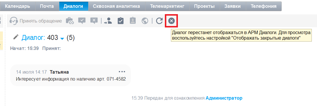 Изменится статус на «Закрыт», и он пропадет из АРМ Диалоги Чтобы посмотреть его повторно, необходимо в фильтре выбрать настройку «Отображать закрытые».