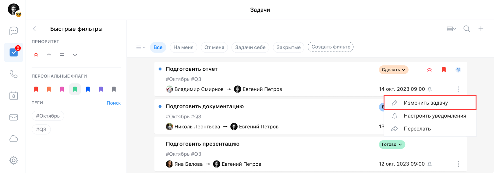 Чтобы изменить задачу, перейдите в сервис Задачи, нажмите на иконку и выберите пункт Изменить задачу: